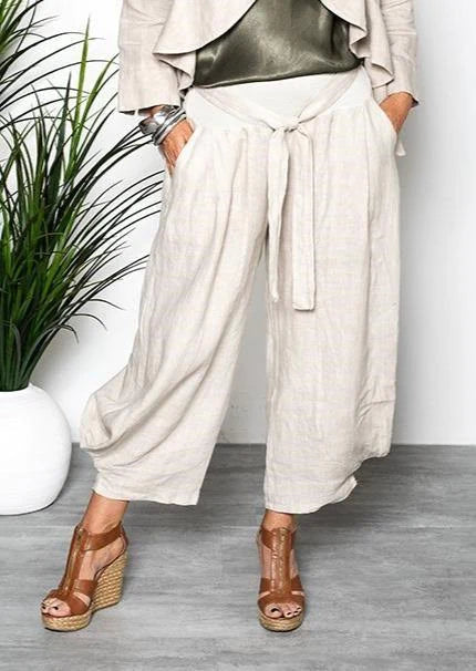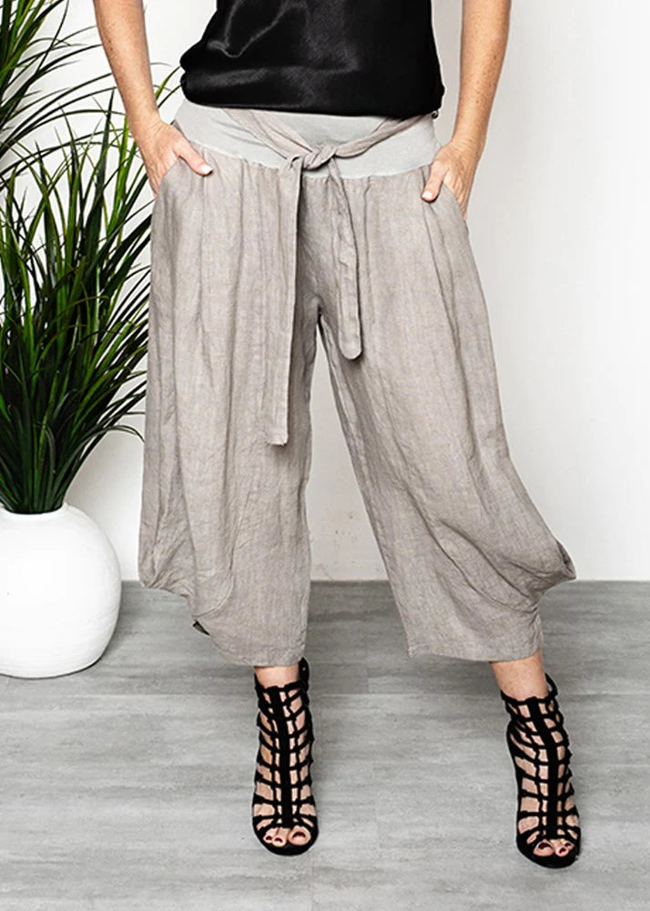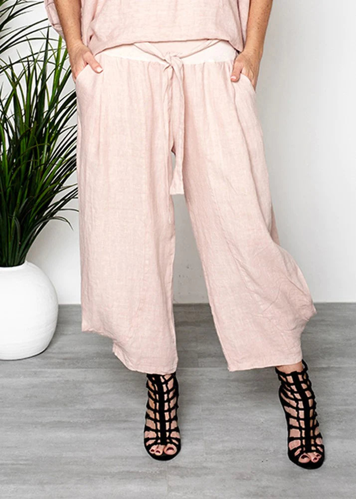 Addison pants are linen pants that have a serene and elegant feel. These pants have made a comeback due to their simple and casual but elegant style. These 100% linen made pants are a comfortable yet stylish design. The pant has a tie belt, stretch cotton knit waistline, and side pockets giving it an air of sophistication. These pants have a clean, sleek, and minimal design, so items perfect for any imaginable occasion.