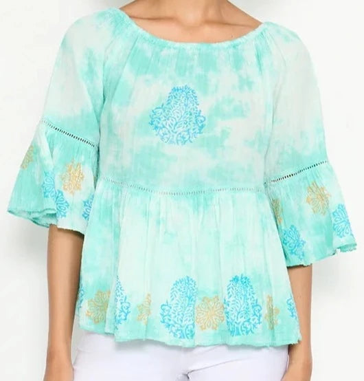 Caju's mint blouse is a masterpiece of refinement, featuring a rounded elastic neckline, billowing sleeves from the elbow, and a gracefully tailored top that cascades from the bust to the hem. Adorn yourself with this regal piece and experience true sophistication.