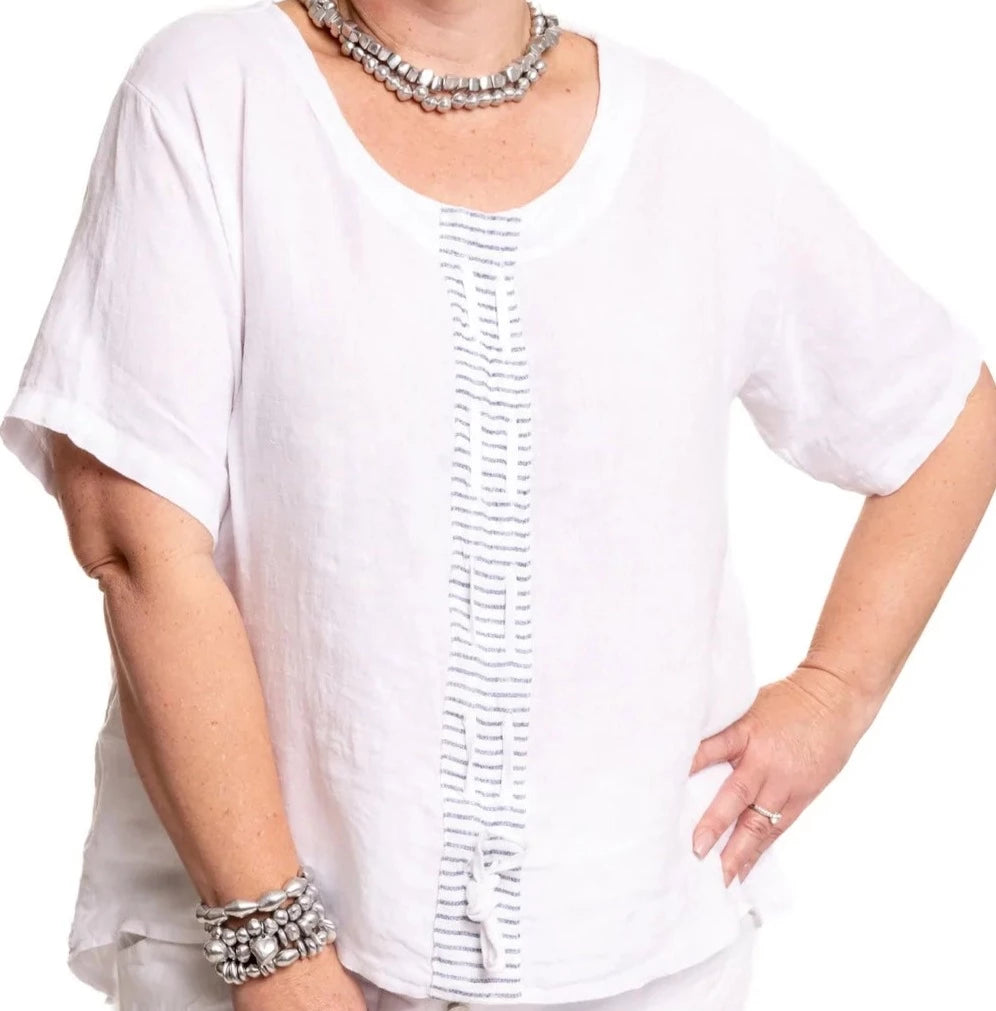 Nautically styled white linen top with the most perfect navy striped trim on a vertical stripe that runs down the centre front of the top and is able to be gathered by pulling two white pull strings at the bottom. With a round neck, short sleeves, a hemline that is slightly longer at the rear than the front, it's just what you've been looking for. Perfect match for the Armada Pants.