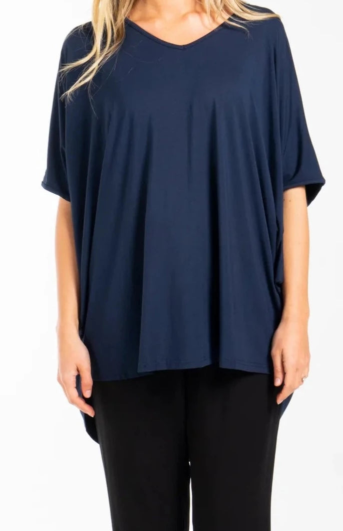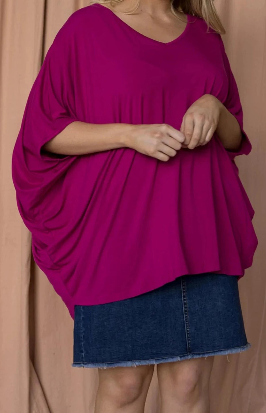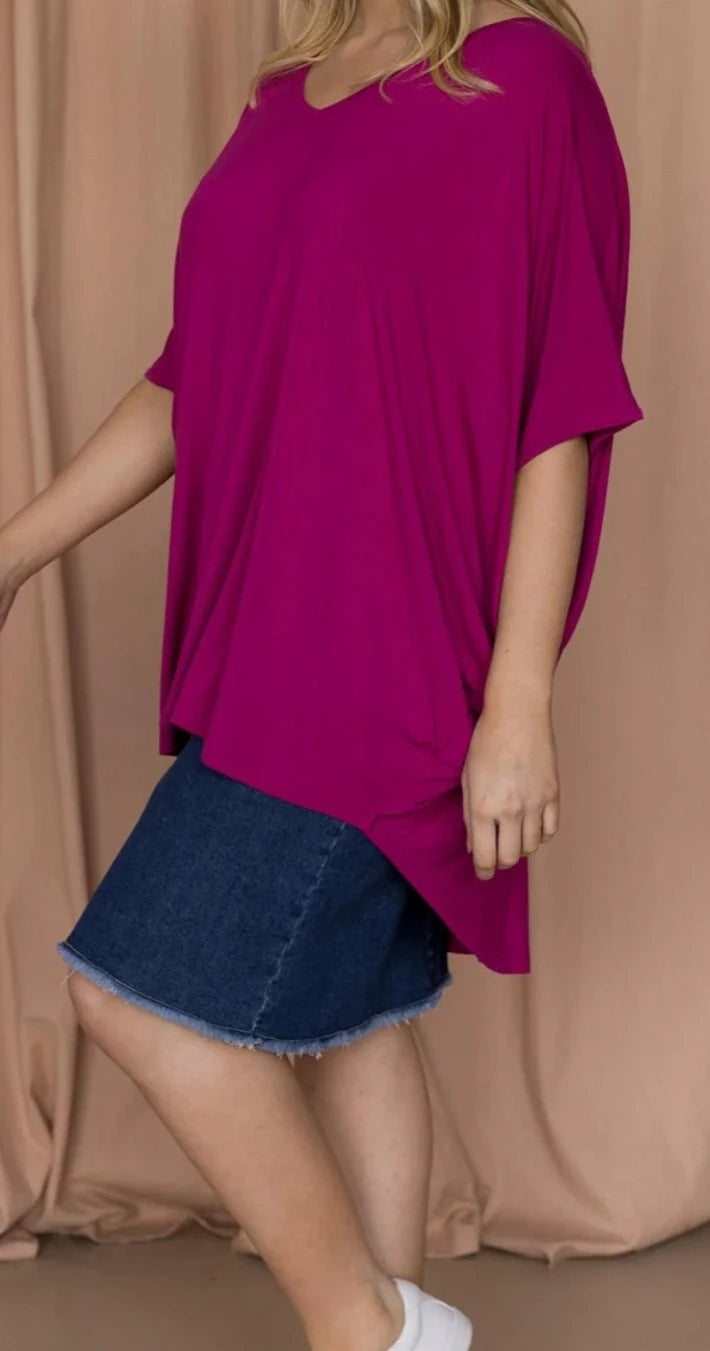 The Hi-Low Miracle Top features a feminine draping style with batwing sleeves, coupled with a flattering V-Neckline. The soft and breathable fabric in Plum is made from sustainable bamboo fibres.