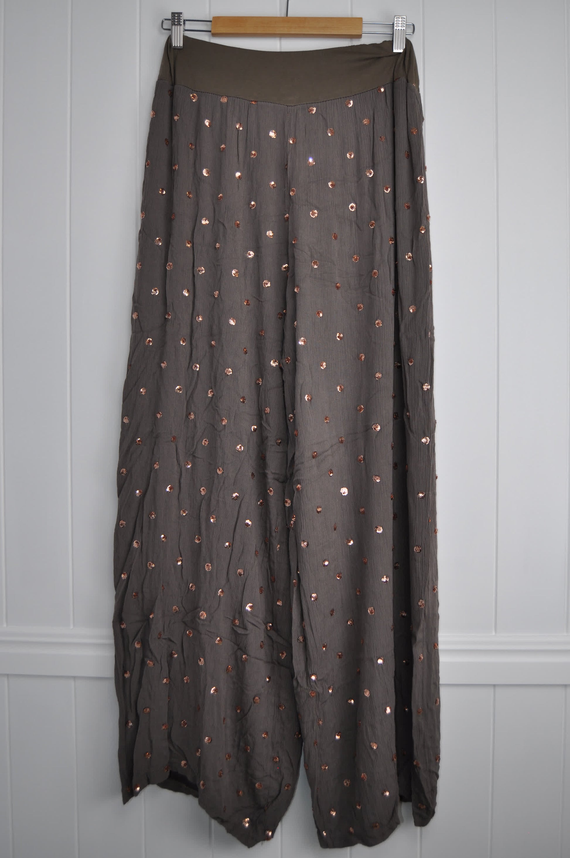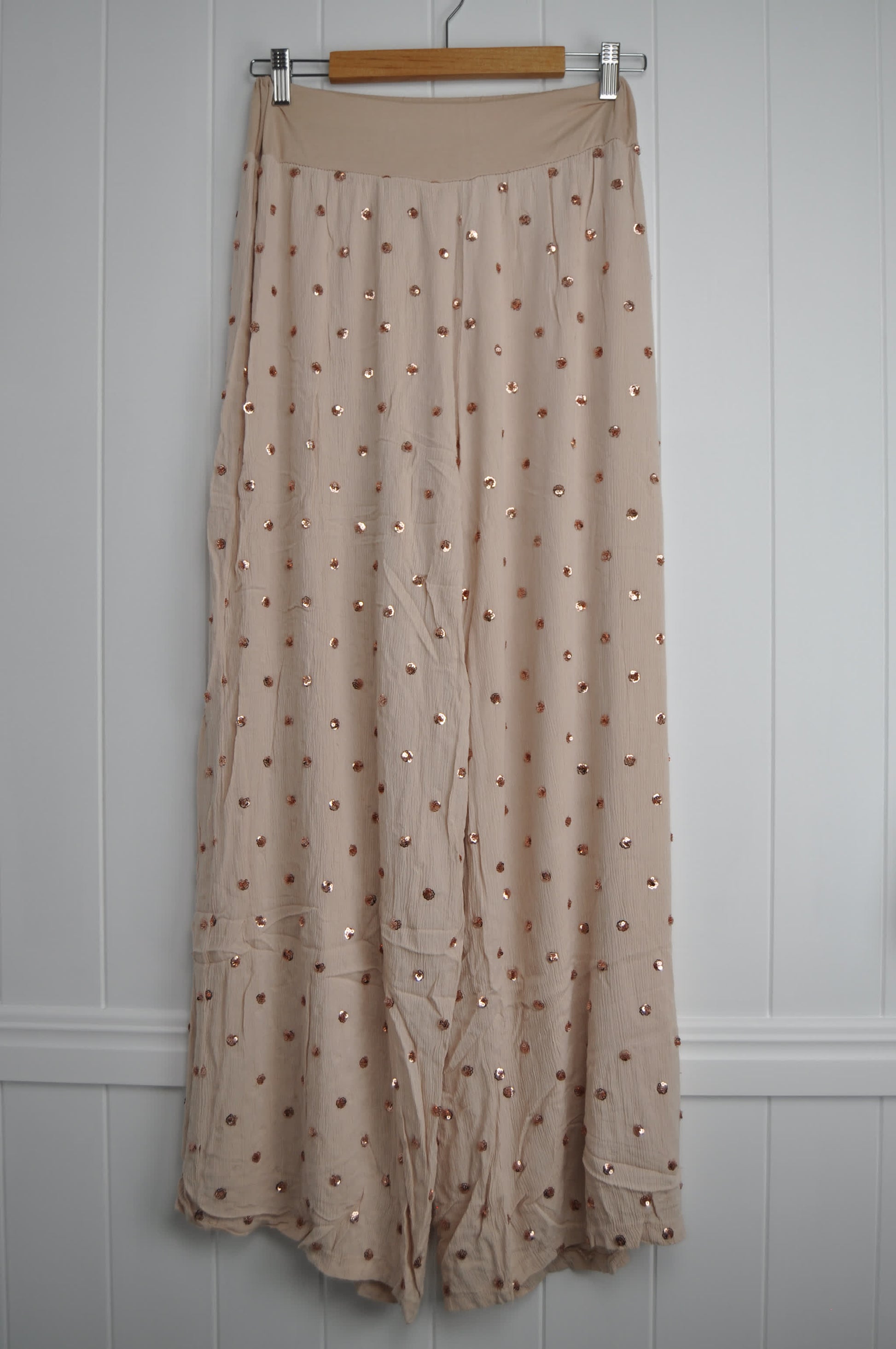Add a touch of luxury to your wardrobe with these fabulous Leylah pants. This fabric is so soft and falls in the most divine way. They are fully lined, have an elasticated waist for extra comfort and are bedazzled with sequinned spots through-out. A perfect match for the Kelly Top (48IM02680).
