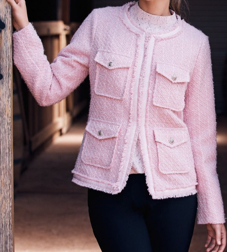 Meet our Braided Tweed Jackets! Crafted from 100% polyester, this jacket is built to last and features fashionable tweed fabrication for a beautiful look. With its gorgeous musk colour, round neckline, long sleeves, and front patch pockets, you’ll be as comfortable as you are stylish. Perfect in any season, it’s sure to elevate any outfit and bring class and sophistication to your wardrobe.