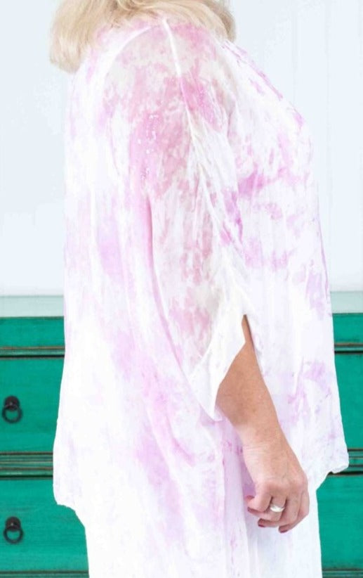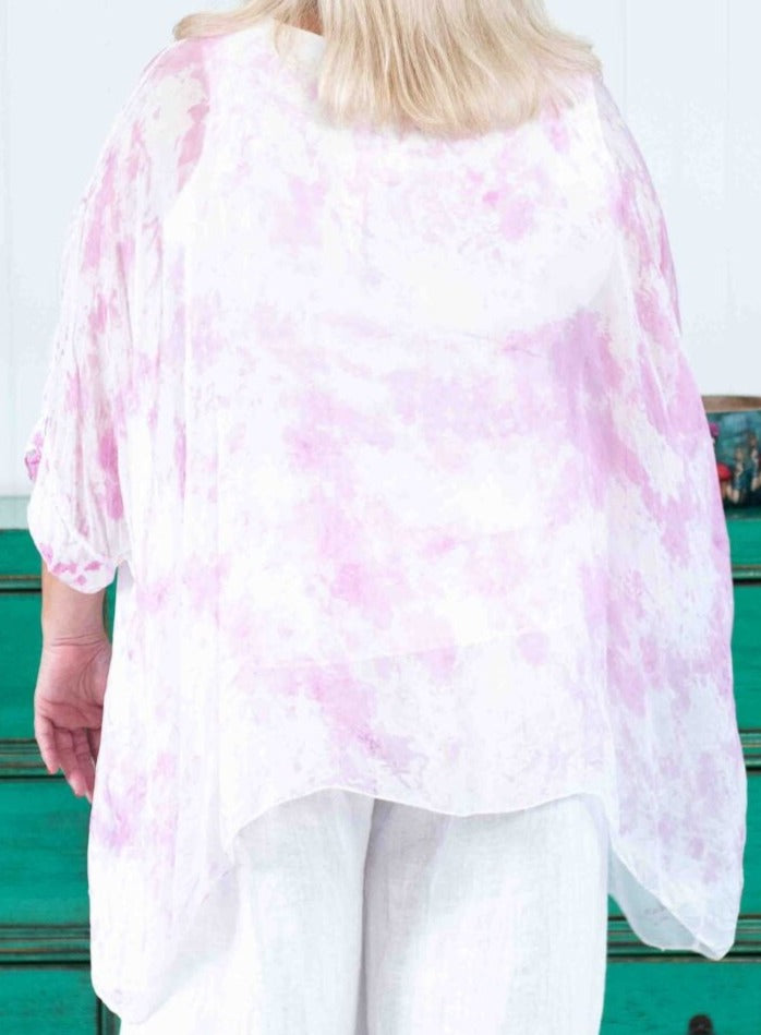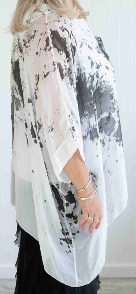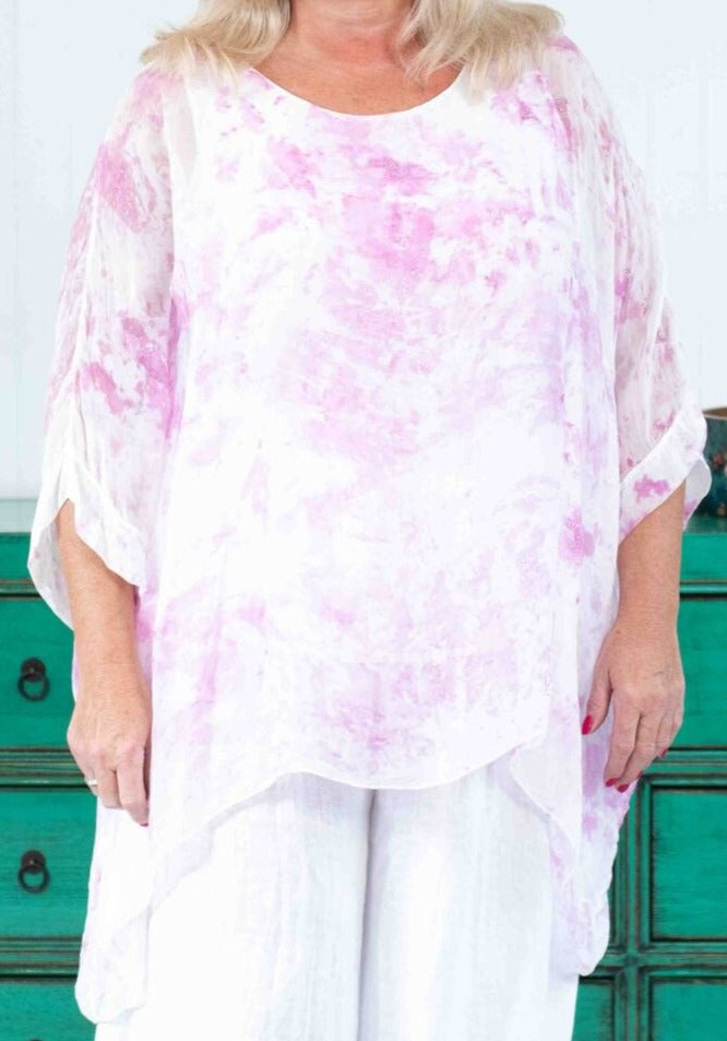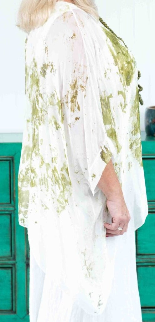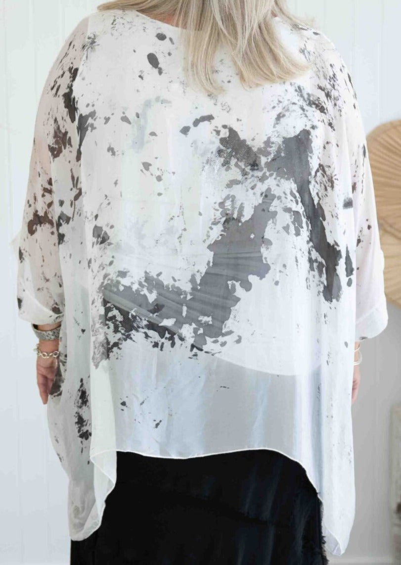 Featuring glamours hand painted sparkled silk blouse. The Jessica Italian Linen Silk Top has a flowy silk piece over a stretch cotton all in one built in singlet. 3/4 sleeves, round neckline. Wear yours with The ”Lacasa Skirt” to elevate your Sunday appeal!