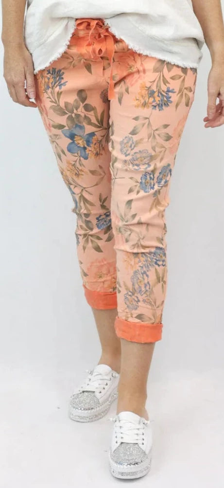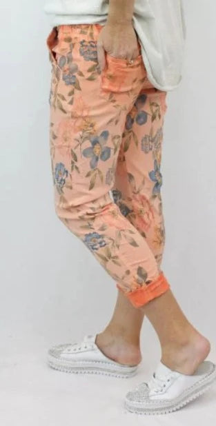 Our lovely PORTER cotton stretch pants are a perfect addition to your summer closet. Our pants are made of stretchable cotton fabric making them comfortable to wear. Decorated with a vibrant floral design, these pants add flare to any outfit. The PORTER pants are both stylish and breathable making them perfect for those hot summer days. Made in Italy.