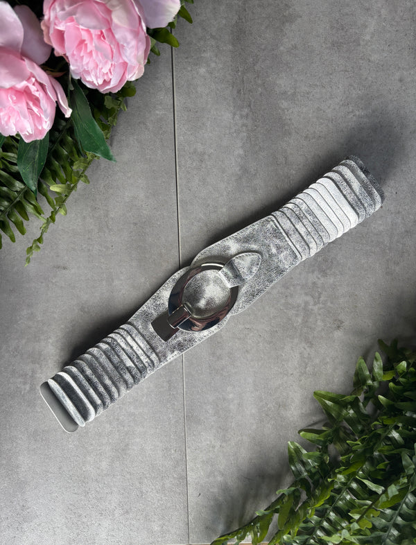 Elasticated faux leather layered belt with an oval silver alloy buckle High-quality materials meet an elevated design. Make a statement with the sophisticated Riccardo Belt.