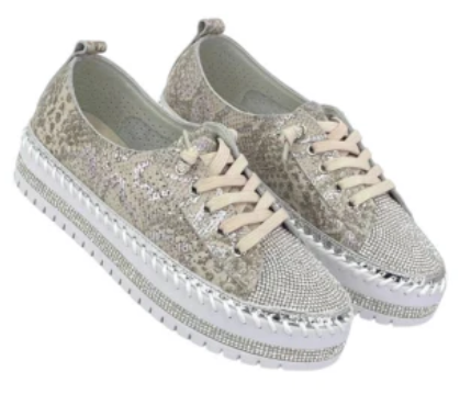 These shoes are a bold fashion statement combining glamour with casual comfort. The design features a sparkling upper adorned with sequins or rhinestones, giving them a dazzling, eye-catching look. The sole is thick and platform-style with additional embellishments, likely rhinestones or metallic elements, adding to the luxurious aesthetic. The neutral and silver tones make them versatile for styling, while the animal print detail adds a trendy, wild edge. Perfect for someone who loves to stand out and add a bit of shine to their outfit.