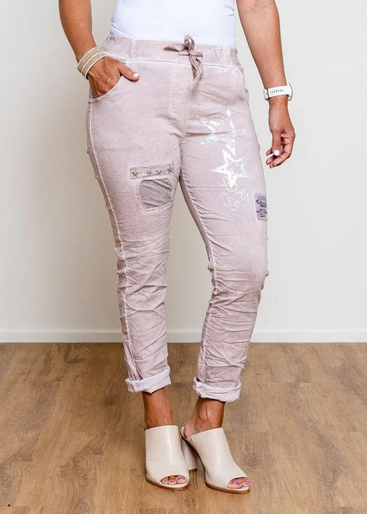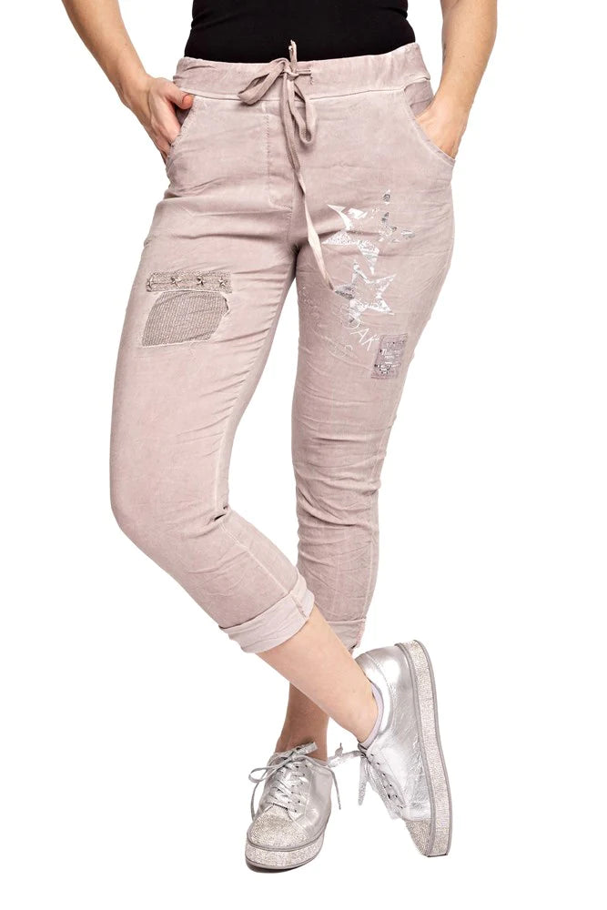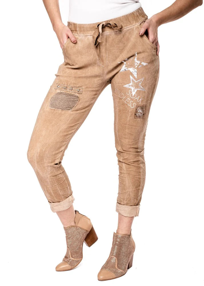 Infinite stretch can be found in these fabulously comfortable full length pants with added bling. A tied waist and patches of not only stars, but lettering and silver as well.