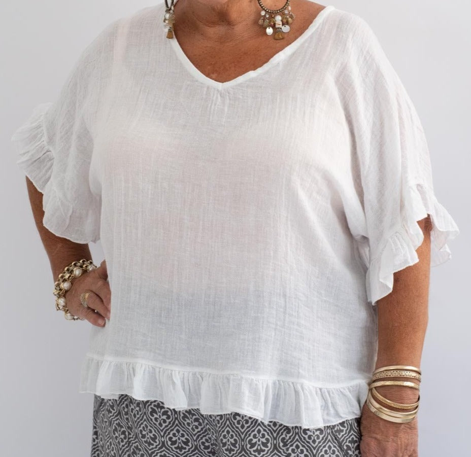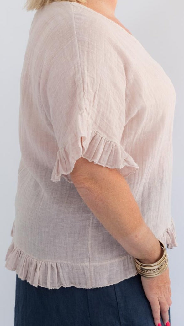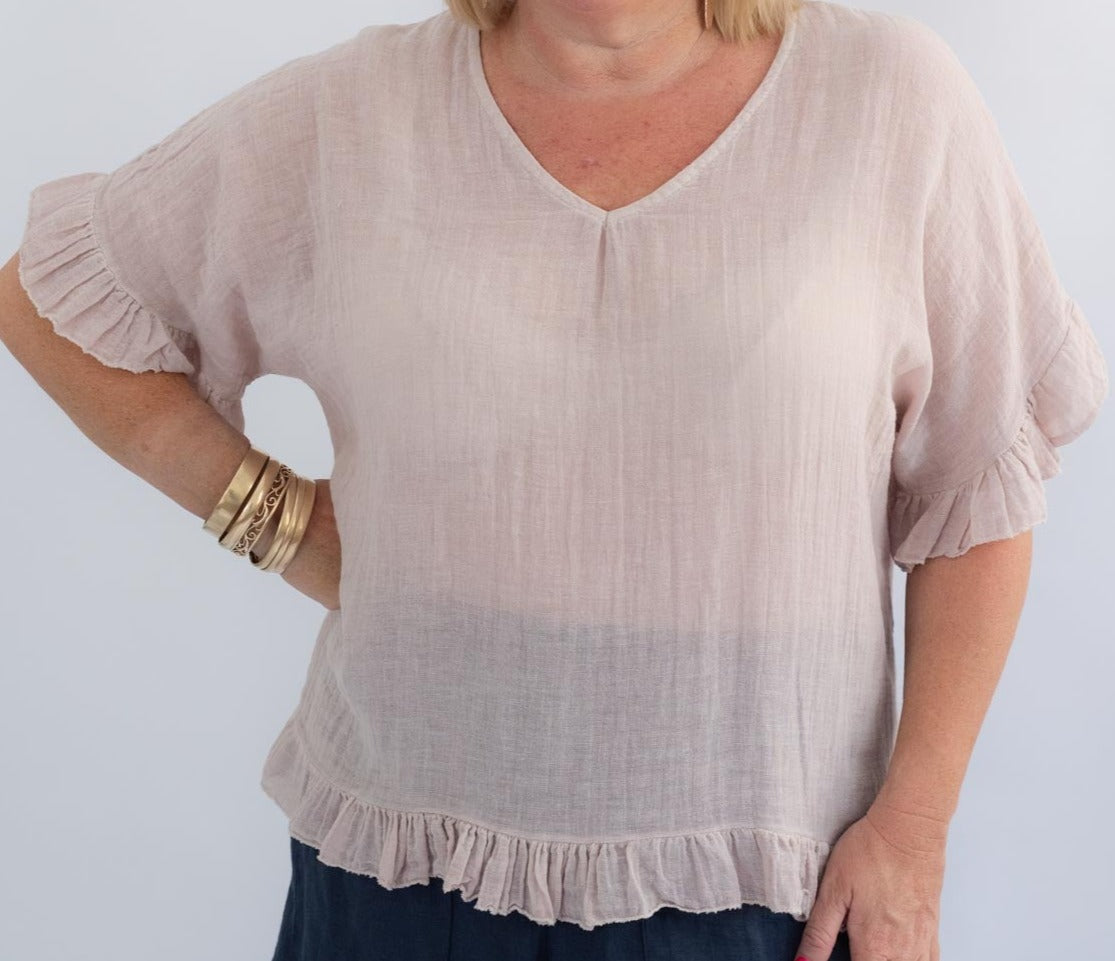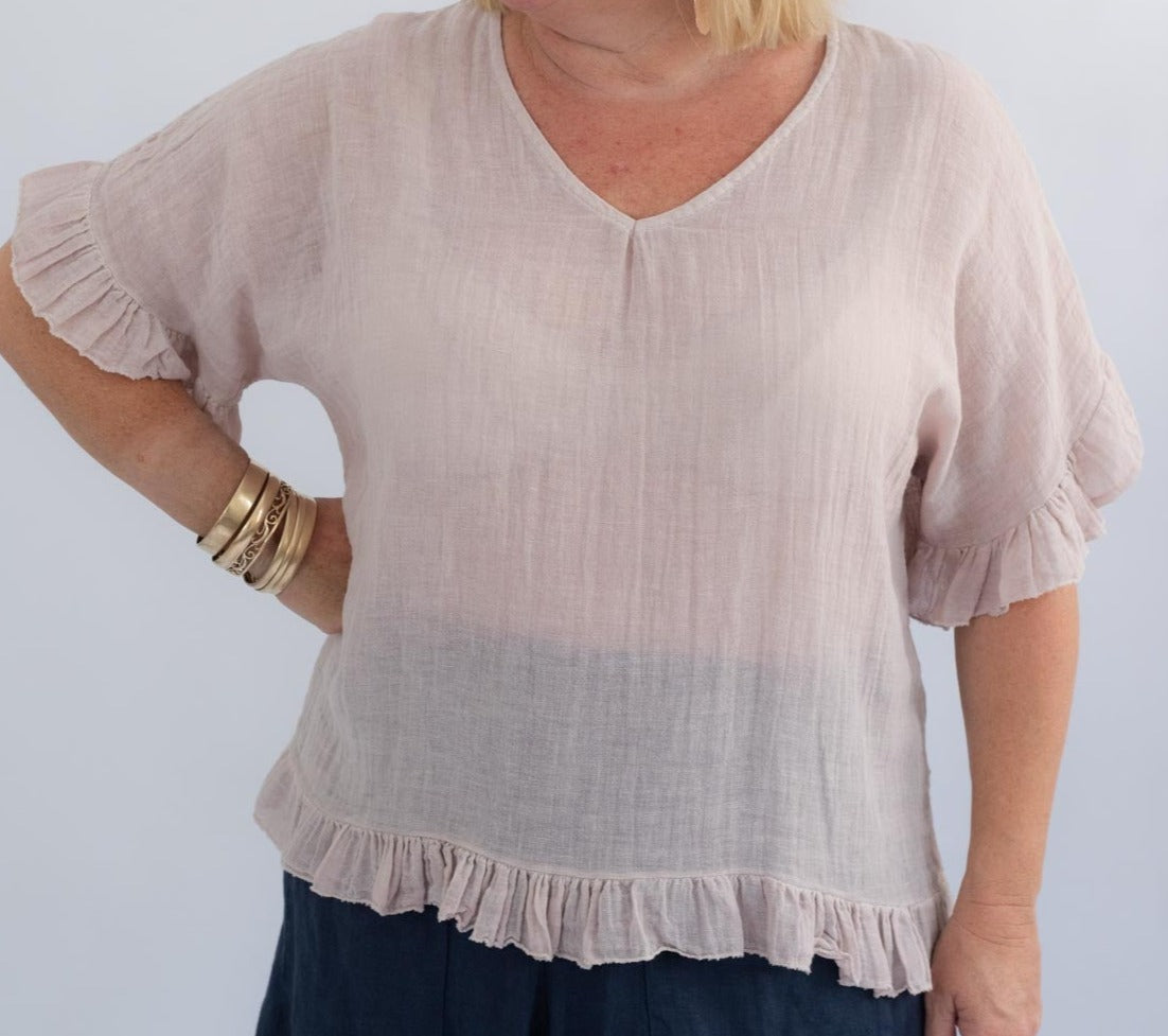 The Temple Soft linen Blouse is designed with a v-neck and frill at the bottom and on the arms detailing. Athenian-inspired look. Wear it with barely-there sandals and a smattering of fine jewelry for a contemporary take on event dressing.