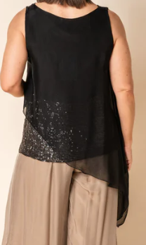 Discover timeless elegance with our sleeveless silk top, designed to make a statement. Featuring a graceful scoop neck and a unique diagonal cut softest silk overlaying a refined sequined straight hem. The two-layer design creates a beautifully textured look, combining the flowing silk with a touch of sparkle for an elevated finish. Perfect for special occasions or a touch of glamour in everyday wear, this top embodies sophistication and style.