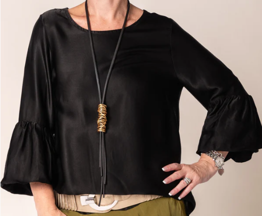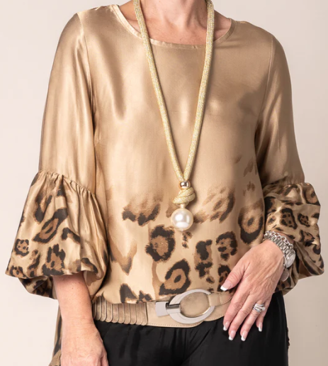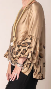 The Karley Satin Finish Top showcases an animal print, long sleeves which feature a stylish bell cuff with the same print for a cohesive look. It has a round neck, with a split at the hemline adding a modern twist to the design. For a stylish on trend look wear it with the matching Victoria Pant.