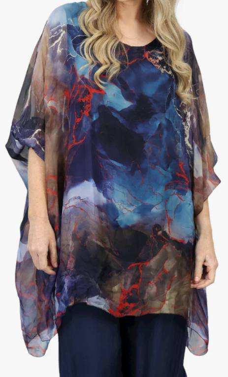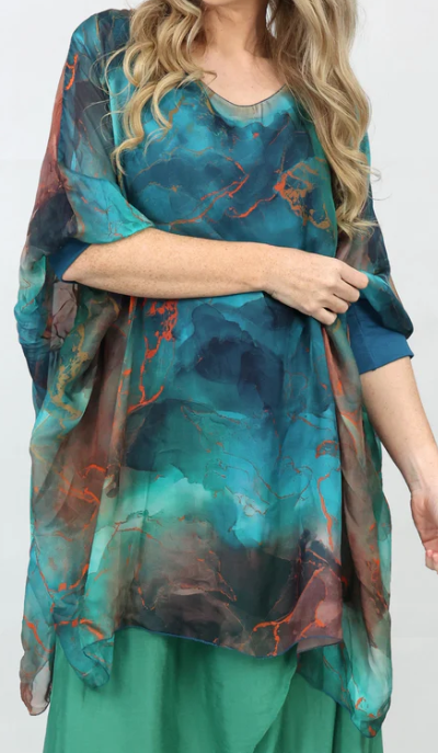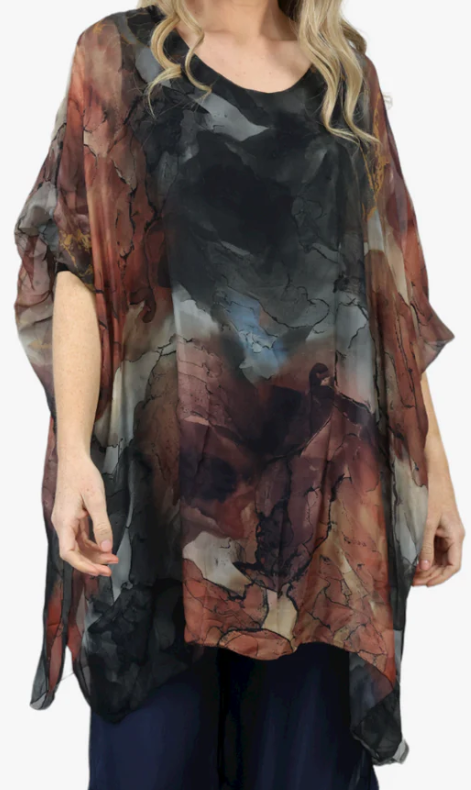 Introducing our luxurious silk kaftan top, Mackay! Crafted from lavish silk, this loose-fitting garment exudes comfort and sophistication. The three-quarter sleeves add a touch of elegance, while the abstract design showcases a captivating and contemporary flair. Embrace the effortless style and timeless beauty of our kaftan-inspired top for a chic and versatile look.