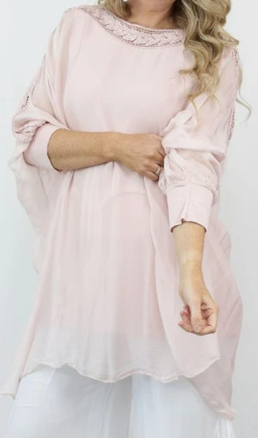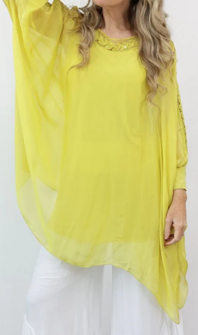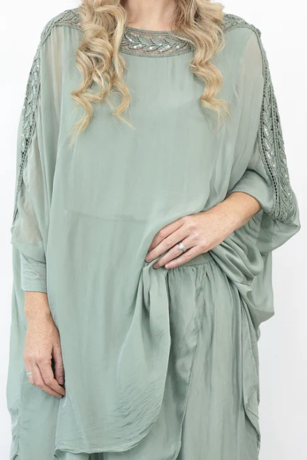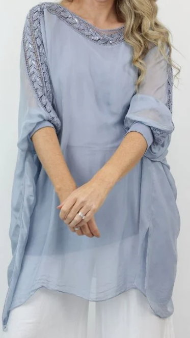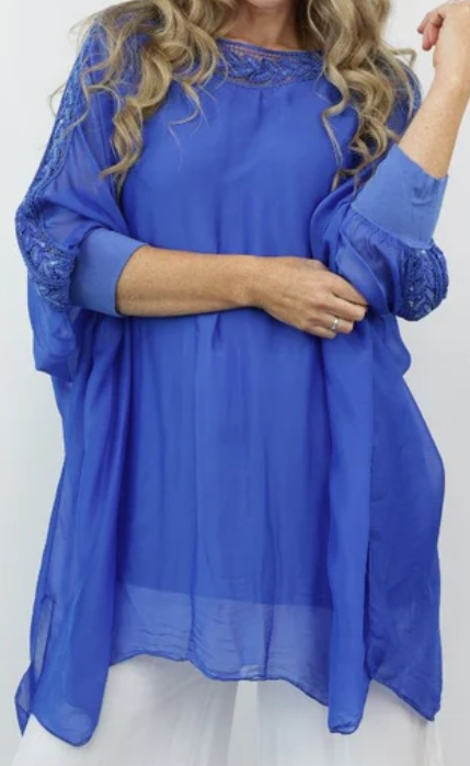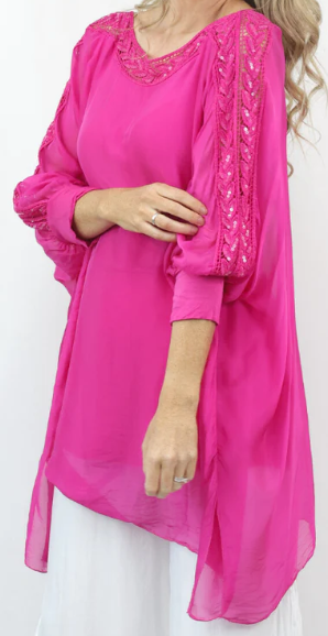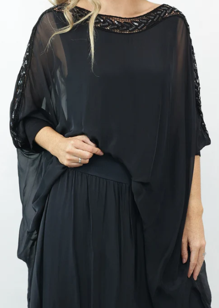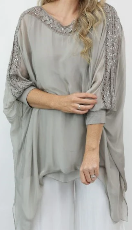 This is Miracle, our stunning silk top with sequin lace sleeves! This loose-fitting garment exudes effortless style and comfort. The three-quarter sleeves add a touch of sophistication, while the solid color creates a timeless appeal. The sequin lace sleeve detail elevates the design, adding a touch of glamour and elegance to any outfit.