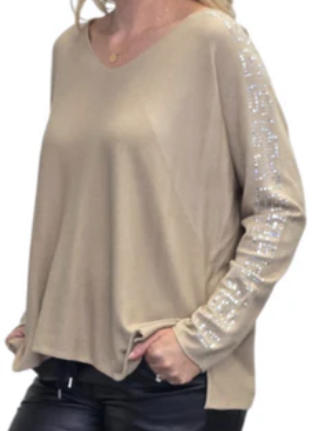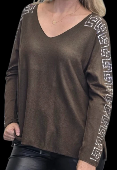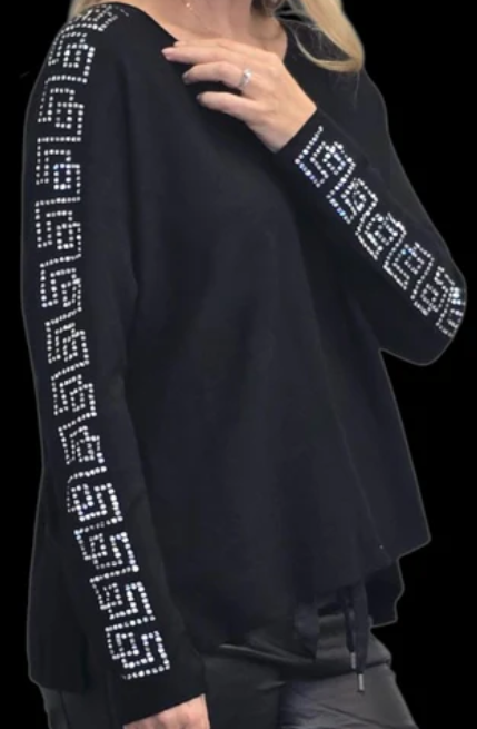 lightweight winter knit with a relaxed, slightly oversized fit. It features long sleeves adorned with a bold, geometric studded pattern that runs from the shoulders down to the cuffs. The embellishments give it a modern, stylish edge—perfect for casual chic or dressed-up winter looks. The soft drape and minimal bulk make it ideal for layering or wearing on its own during cooler days.