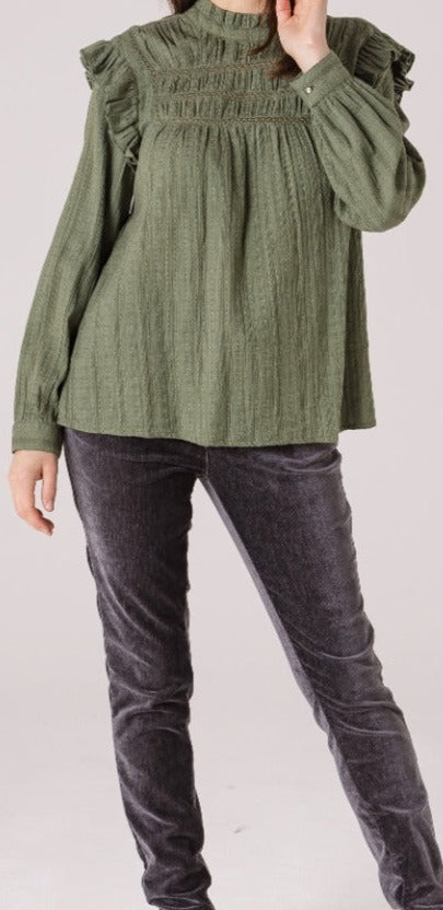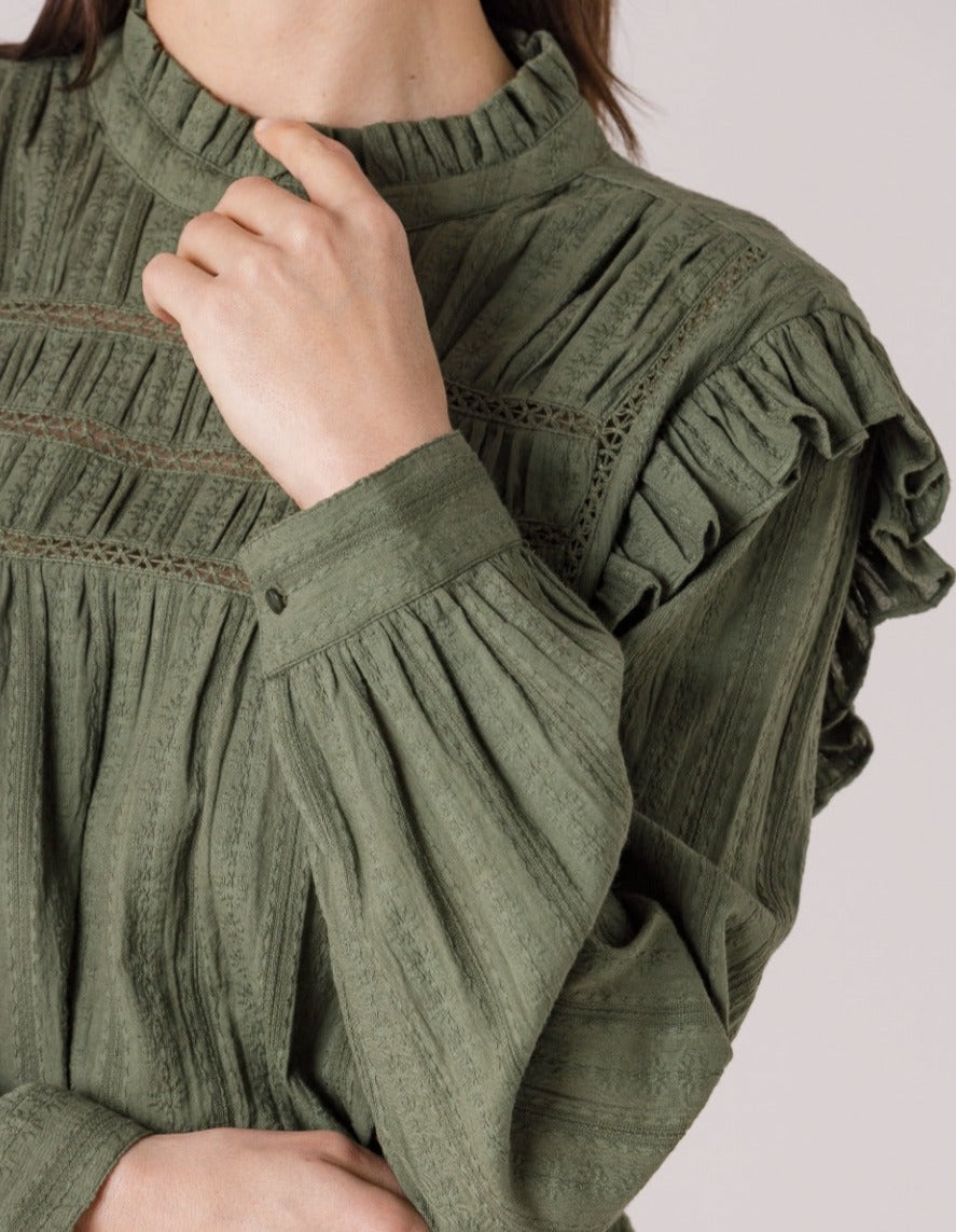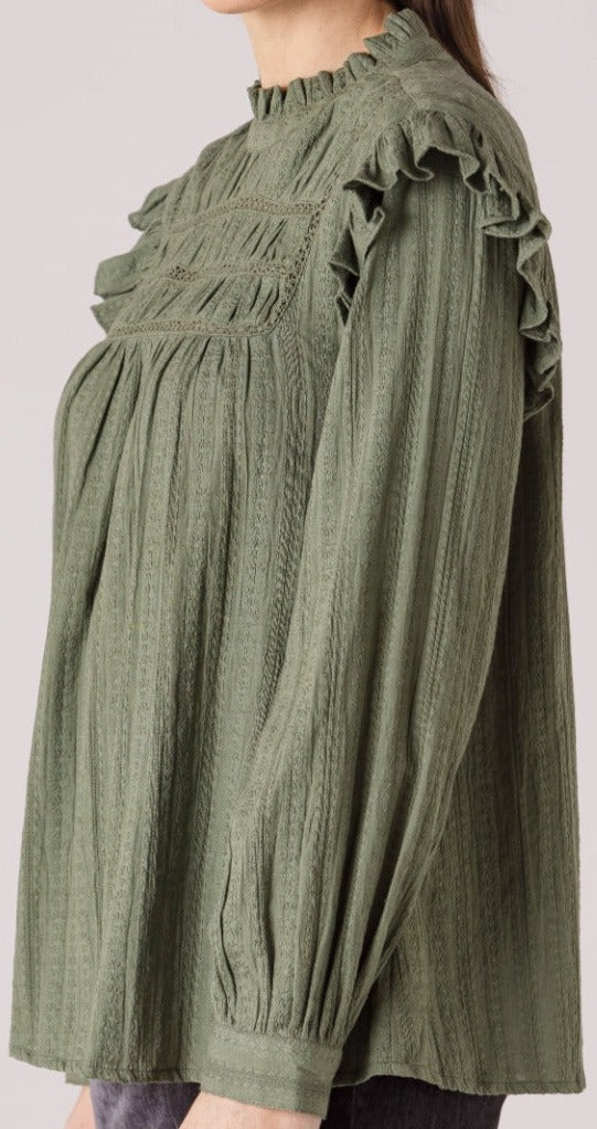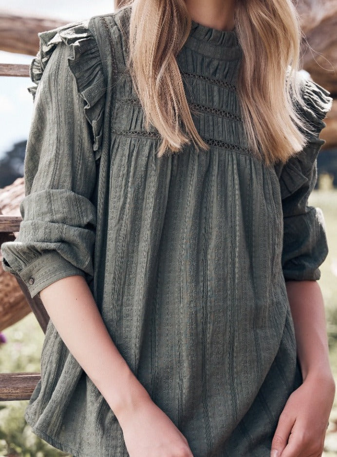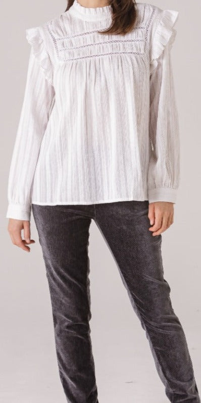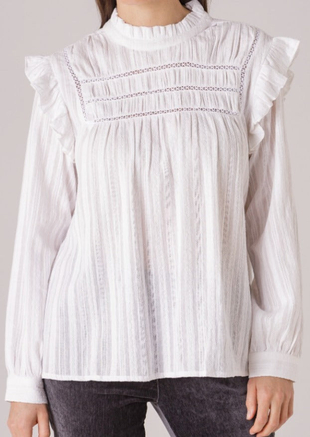 Introducing our Lace Trim Dobby Top, the perfect blend of vintage charm and modern sophistication. Crafted from high-quality 100% cotton, this top features exquisite details that will make you stand out in any crowd. The ruffle detailing on the collar and shoulder adds a touch of femininity, while the ladder lace detail on the shoulder and chest creates a unique and eye-catching texture. The gathered detail on the chest creates a flattering silhouette, and the button cuffs offer a tailored finish. The back keyhole button loop makes it easy to slip on and off, and the relaxed fit ensures comfort all day long. Whether you dress it up or down, this top is a versatile addition to any wardrobe. Don't miss out on this stunning piece - order yours today!